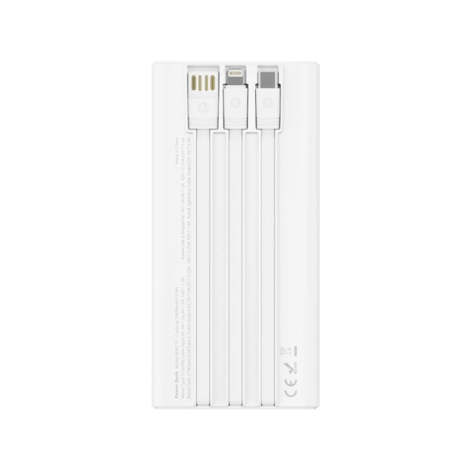 Never search for a cable again. The MX0131 Power Bank features three built-in charging cables (USB-C, Lightning, and Micro-USB) and an additional USB-C output port, offering unparalleled convenience in a compact 10000mAh package. With 22.5W Super Fast Charging support, it quickly powers up your devices. The sleek white ABS+PC design is as durable as it is portable, making it the perfect, no-hassle power companion for daily commutes and short trips.