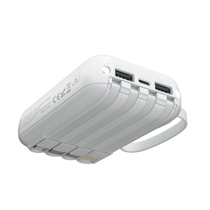 MX0137 Slim Power Bank 5400mAh with 4 Cables – Ultra Portable, 4 Built-in Cables (Type C/Lightning/Micro/USB-A), 5V/2A Output, ABS+PC White